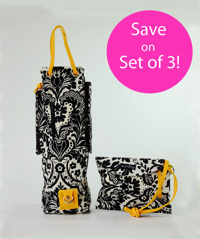 A very clever new wine bag may be the answer. It is a small handbag that hangs on the wrist and holds essentials such as compact, lipstick, keys, ID and phone. Unclip it, and it becomes a wine tote, her essentials intact in a separate pocket. We found it at www.winegabby.com. There’s a video that illustrates how to go from small, stylish handbag to wine or spirits bag and back again. We like the pretty spring-like fabric for summer parties (with the shortest day behind us, we’re ready to think spring!) or for a more sophisticated look, consider the always-chic black and white version. The bags cost $39.00 each.