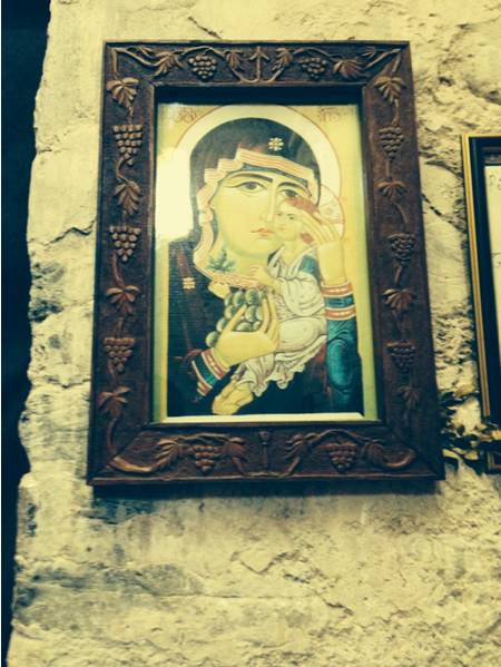 One of the many paintings of the Madonna holding grapes for the Child in the 6th C. Jvari Monastery in Mtskheta. The painting also has grapes carved into the frame.