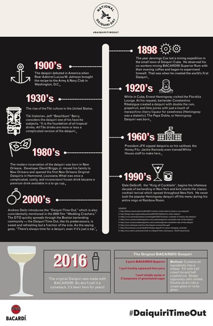 The drink dates back to 1898 when Jennings Cox led a mining expedition to the town of Daiquiri, Cuba. The locals added Bacardi rum to their evening coffee, which prompted Jennings to experiment with other ways to use the rum. He came up with the Daiquiri. So glad he named it after the town, not himself! Check this infographic to find other fun facts in the long history of this cocktail and the recipe for the Original drink created by Mr. Cox below.