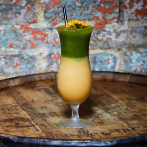 Method: Combine all ingredients of Jäger Colada in blender with half cup of ice. Blend. Pour into bottom of hurricane glass. Combine all ingredients of Matcha-mint Gimlet in blender with half cup ice. Blend, pour on top of Jäger Colada. Garnish with grated orange peel and matcha powder.