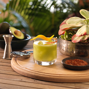 Method: Cut the avocado in half and remove the pit. Scoop out half of one side and add to cocktail tin, mashing with spoon until soft. Add liquid ingredients to the tin, use a spoon to release avocado from the side of the tin, and “dry shake” the contents (without ice) until the avocado is broken up and emulsified. Rim a double Old Fashioned glass with chipotle chili salt* and fill with ice. Add ice to shaker tin and shake vigorously until well chilled. Use a mesh strainer to “fine strain” the cocktail into the iced glass. Garnish with a ribbon of mango.