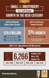 April 11, 2018 – We keep seeing stories about the craft beer revolution being over or on life support, but a report published two weeks ago by the Brewers Association shows that small and independent craft brewers are still on a growth trajectory. In 2017 they represented 13 percent market share by volume and 23.4 percent in retail dollar value. The total beer market is estimated to be worth $26 billion at retail.